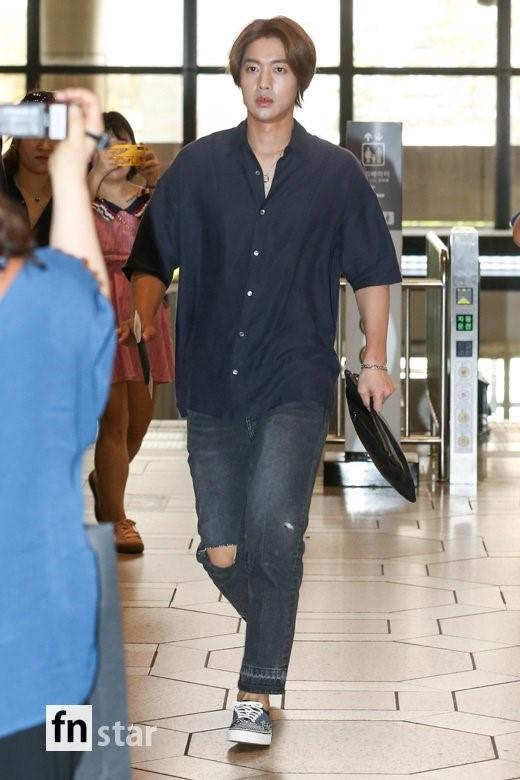 Kim Hyun Joong tại sân bay Gimpo sáng 4/6. Anh hiện đang thực hiện fanmeeting vòng quanh Châu Á sau 4 tháng được minh oan scandal bạo hành bạn gái cũ