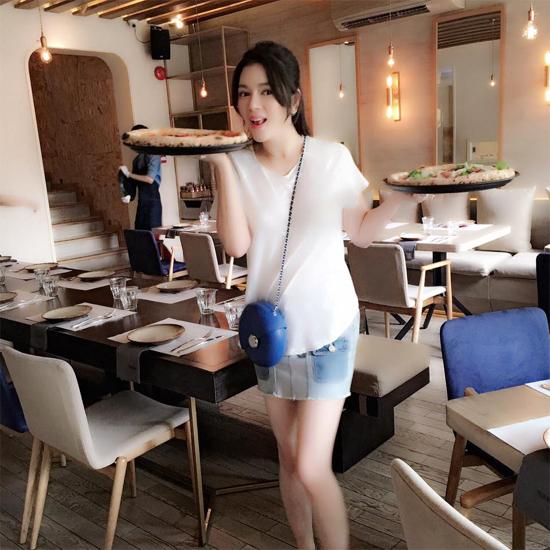Evening được cô mix "ăn dơ" với chân váy denim và áo sơ mi trắng. Đây là