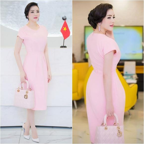 Khi diện bộ váy hồng ngọt ngào, cô khéo léo lựa chọn túi Dior màu đồng điệu.