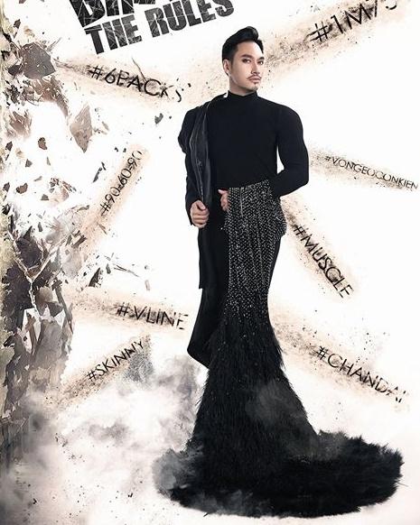 Nếu các sao nam khác chọn quần váy đen, tối màu bụi bặm cá tính thì Lý Quí Khánh lại gây choáng với thiết kế đầm dạ hội đen quý phái, khiến người xem chỉ biết câm nín.