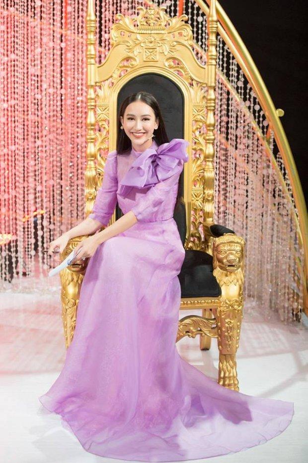 Á hậu Hà Thu nhẹ nhàng, thướt tha trên nền tím Lilac. Người đẹp chọn sắc độ tím phù hợp, thể hiện cá tính, thần thái đĩnh đạc của mình trên cương vị giám khảo cho một Gameshow truyền hình.
