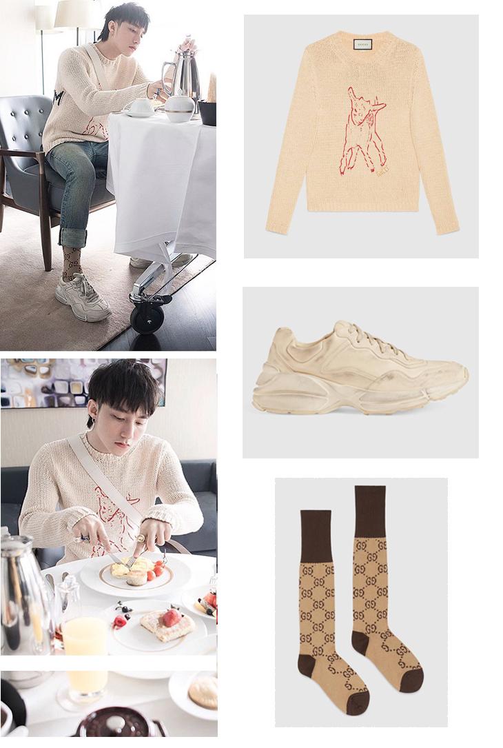 Outfit thứ 2 ấn tượng không kém vẫn cả cây Gucci yêu thích, áo len có giá tới gần 40 triệu đồng, đôi “giầy bẩn” có giá khoảng 17 triệu đồng và tất logo Gucci.