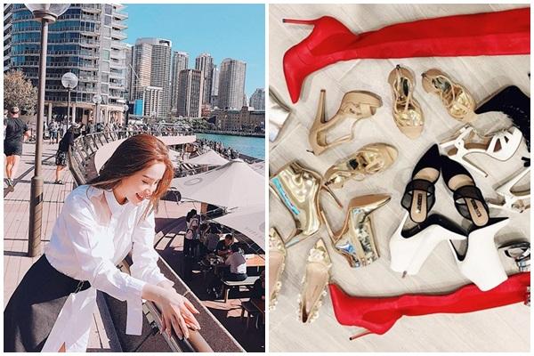 Trong chuyến lưu diễn ở Úc trong tháng, người đẹp tiếp tục khiến giới điệu mộ ghen tị khi khoe chiến tích hàng hiệu 11 đôi giầy đủ mẫu mã từ các thương hiệu hàng đầu thế giới. Loạt giày này có giá không dưới 100 triệu đồng.