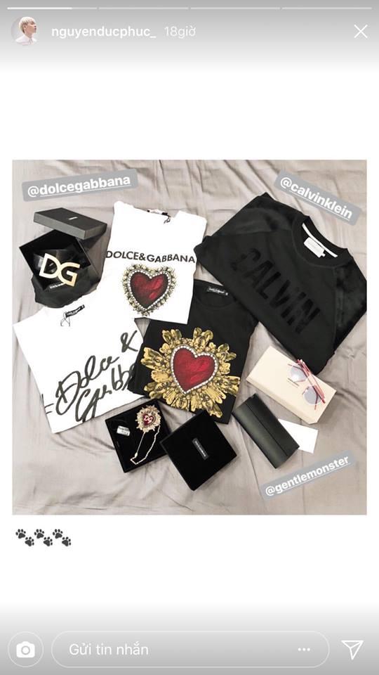 Hình ảnh đống chiến lợi phẩm mới tậu của Đức Phúc. Nam ca sĩ mạnh tay sắm hẳn 4 chiếc áo phông đến từ thương hiệu Calvin Klein, D&G. Mỗi chiếc có giá trên dưới chục triệu đồng. Phiên bản kính của nhà mốt Gentle Monster có giá 6 triệu đồng.