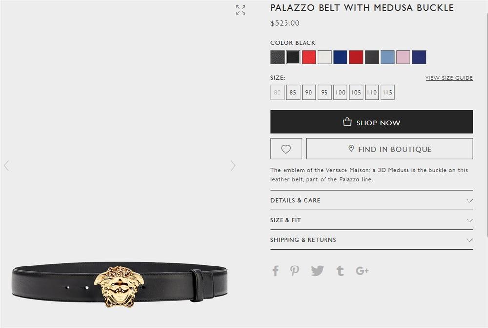 Thắt lưng có phom dáng cơ bản, điểm nhấn duy nhất chính là mặt khóa đầu Medusa được mạ vàng sáng bóng. Sản phẩm này có giá 525 USD tương đương 12 triệu đồng.