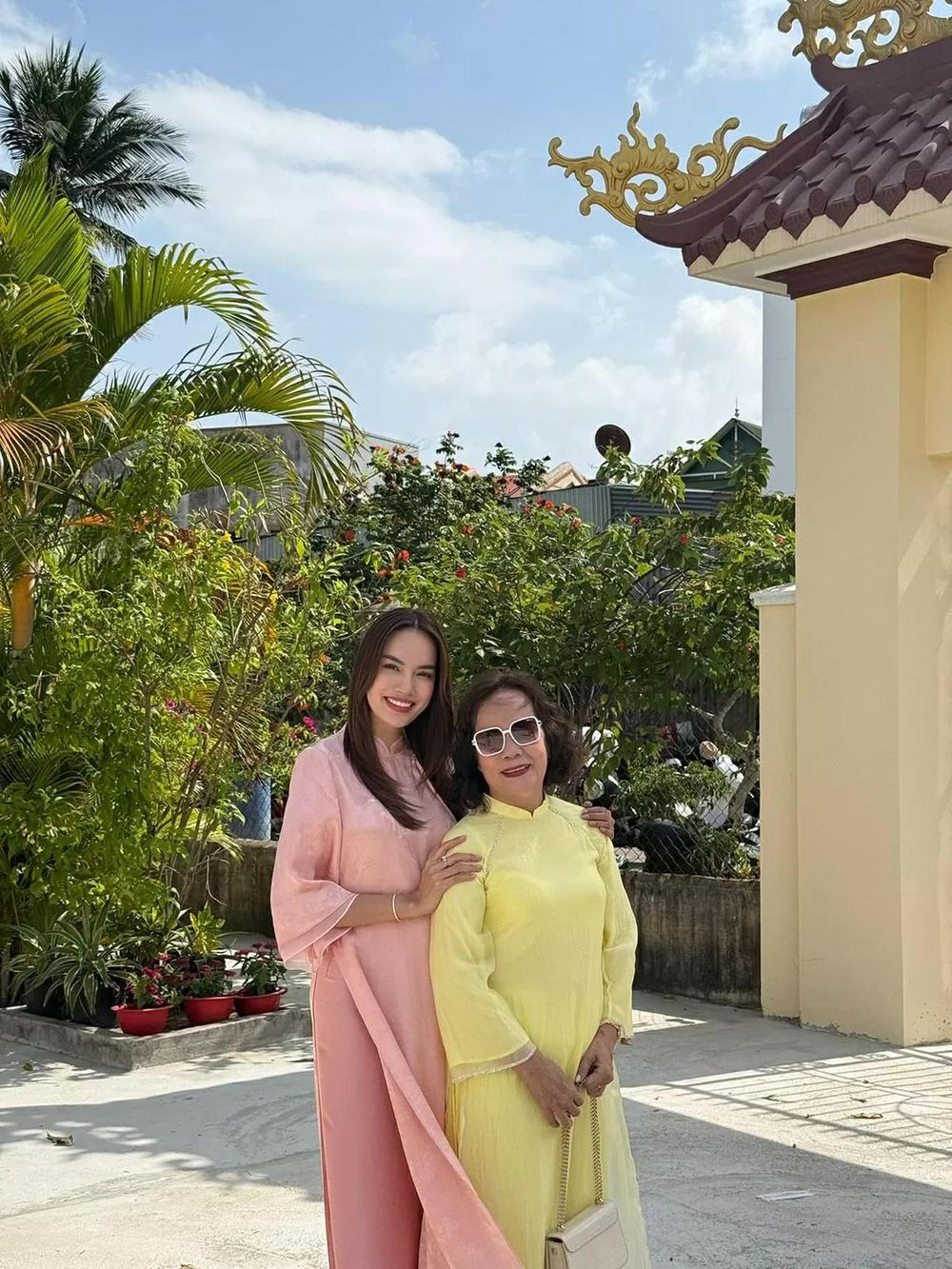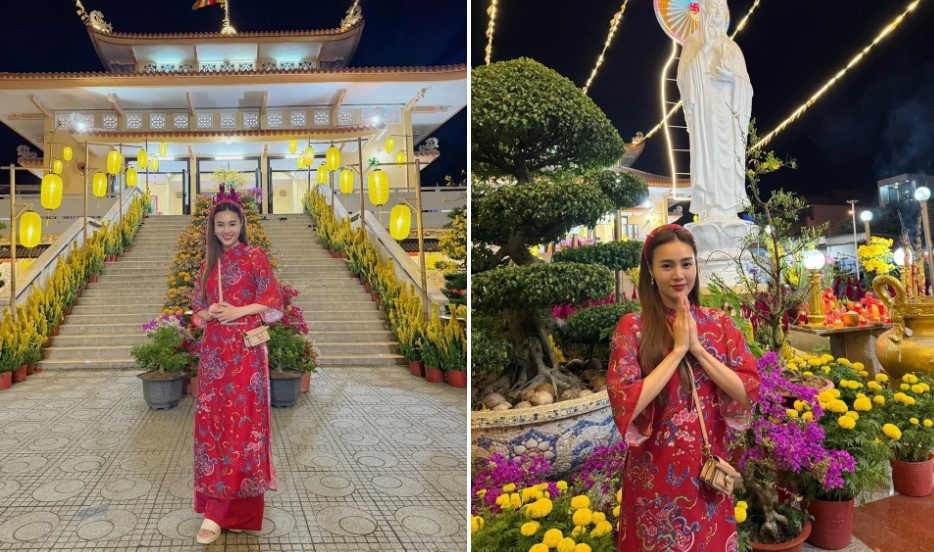Hoa hậu Lê Hoàng Phương và mẹ đi chùa vào sáng mùng 1 Tết, cầu bình an, sức khỏe trong năm mới.