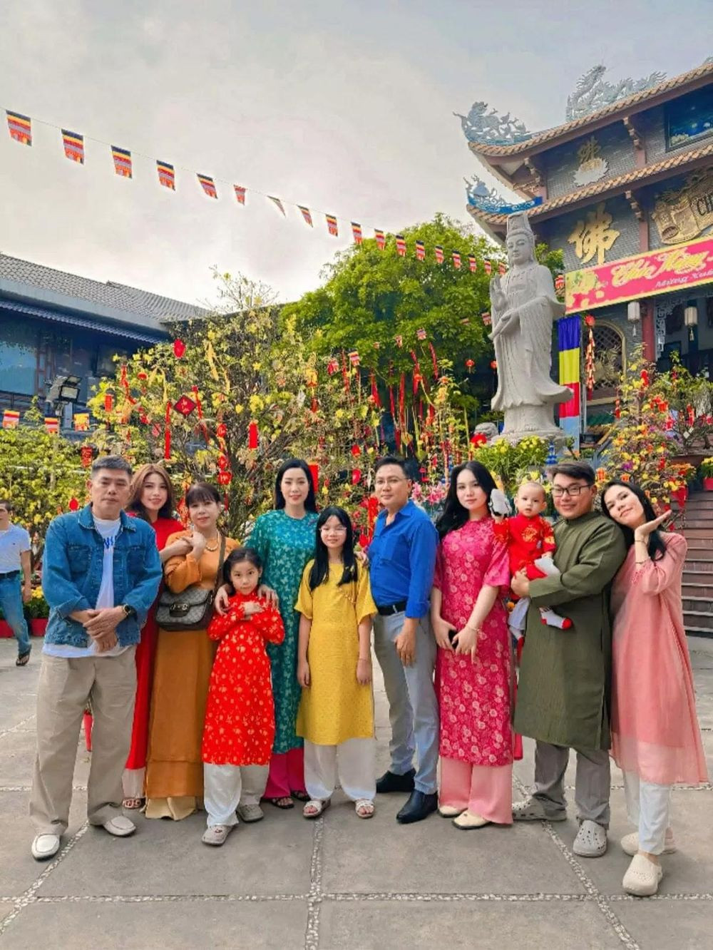 Gia đình diễn viên Trang Nhung xúng xính áo dài chụp ảnh kỷ niệm trước chùa Kim Liên ở Hà Nội.