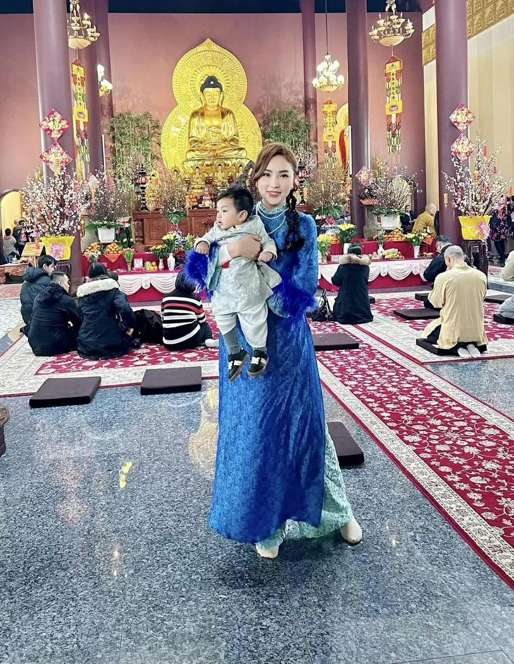 Ở Berlin, Đức, diễn viên Quỳnh Thư bế con trai tới thắp nhang, lễ Phật tại một ngôi chùa gần nhà.