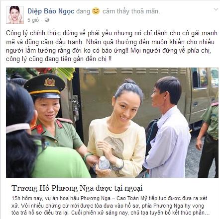 Giống như nhiều đồng nghiệp, Ngô Thanh Vân theo dõi khá kỹ phiên tòa Nga - Mỹ. Giữa thời điểm trắng đen chưa tỏ, đả nữ họ Ngô chỉ gửi lời động viên tới Phương Nga: "Hãy cố lên, hãy bảo vệ phụ nữ, hãy mạnh mẽ lên. Những người phụ nữ cần được bảo vệ".