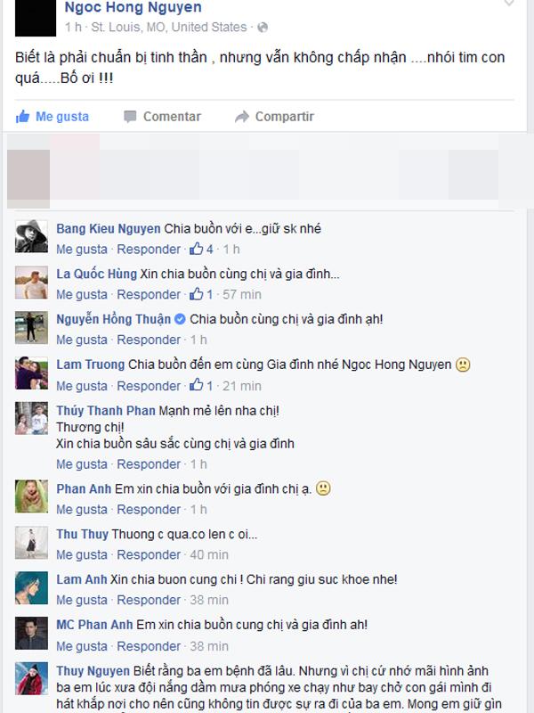 Sau lời chia sẻ đau buồn của Hồng Ngọc nhiều sao Việt đã gửi lời chia buồn và động viên tới nữ ca sỹ cùng gia đình. Ai cũng mong Hồng Ngọc dù có đau buồn cũng cố gắng giữ gìn sức khỏe để cùng gia đình lo chu toàn công việc cho bố.