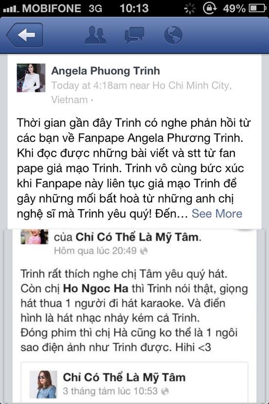 Vào giữa tháng 8 vừa qua, không ít cư dân mạng đã rất bất ngờ với thông tin Angela Phương Trinh “liều lĩnh” chê bai ca sĩ Hồ Ngọc Hà trên trang mạng xã hội cá nhân. Sự việc này bắt nguồn từ việc một fanpage được cho là của “bà mẹ nhí” đăng tải nội dung: “Trinh rất thích nghe chị Tâm yêu quý hát. Còn chị Hồ Ngọc Hà thì Trinh nói thật, giọng hát thua một người đi hát karaoke. Và điển hình là hát nhạc nhảy kém hơn cả Trinh. Đóng phim thì chị Hà cũng không thể là một ngôi sao điện ảnh như Trinh được. Nói tầm thường là quá đúng, chẳng phải, từ trước đến nay, giọng hát của Hà Hồ vẫn được đánh giá là trung bình tệ. Khi hát live, Hồ Ngọc Hà chỉ sở hữu một giọng hát thường thường bậc trung có khi còn thua cả các ca sĩ trẻ. Lợi thế của cô chính là hình thể của một siêu mẫu và những màn nhảy nhót uốn éo còn có nghề hơn cả một vũ công chuyên nghiệp hoặc những cô vũ công ở quán bar” .