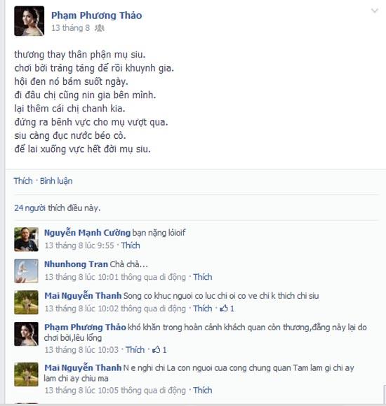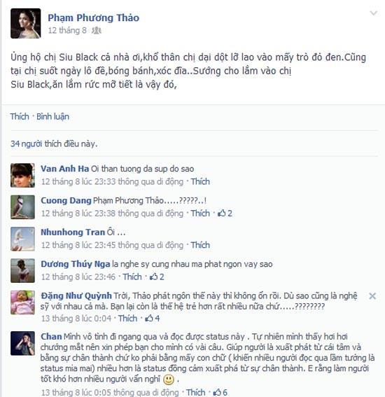 Trong thời điểm thông tin ca sĩ Siu Black bị “vỡ nợ” làm xôn xao dư luận thì một facebook có hình ảnh của nữ ca sĩ dòng nhạc dân gian Phương Thảo lại liên tục cập nhật những nội dung để chế giễu “Họa mi núi rừng”. Đỉnh điểm của sự việc trên đó là việc tài khoản facebook này đã viết hẳn một bài vè với nội dung “Thương thay thân phận mụ Siu/ Chơi bời trác táng để rồi khuynh gia/ Hội đen nó bám suốt ngày/ Đi đâu chị cũng nin ja bên mình/ Lại thêm cái chị Chanh kia/ Đứng ra bênh vực cho mụ vượt qua/ Siu càng đục nước béo cò/ Để lai xuống vực hết đời mụ Siu” gây tranh cãi rất nhiều trên mạng xã hội.