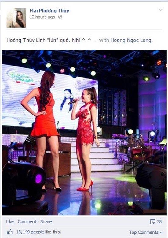 Scandal ảnh “nóng” giả mới kết thúc cách đây không lâu thì mới đây Mai Phương Thúy lại tiếp tục bị dính vào tai tiếng với tin đồn “dìm hàng” người bạn thân thiết của mình. Bị cho là phát biểu thiếu suy nghĩ và vô duyên khi cập nhật hình ảnh của mình và Hoàng Thùy Linh với dòng trạng thái “Hoàng Thùy Linh lùn quá” trên fanpage với 300 nghìn thành viên, Hoa hậu Việt Nam 2006 đã ngay lập tức “phản pháo” lại thông tin trên để tránh cho sự việc đi quá xa và vượt quá tầm kiểm soát của bản thân.