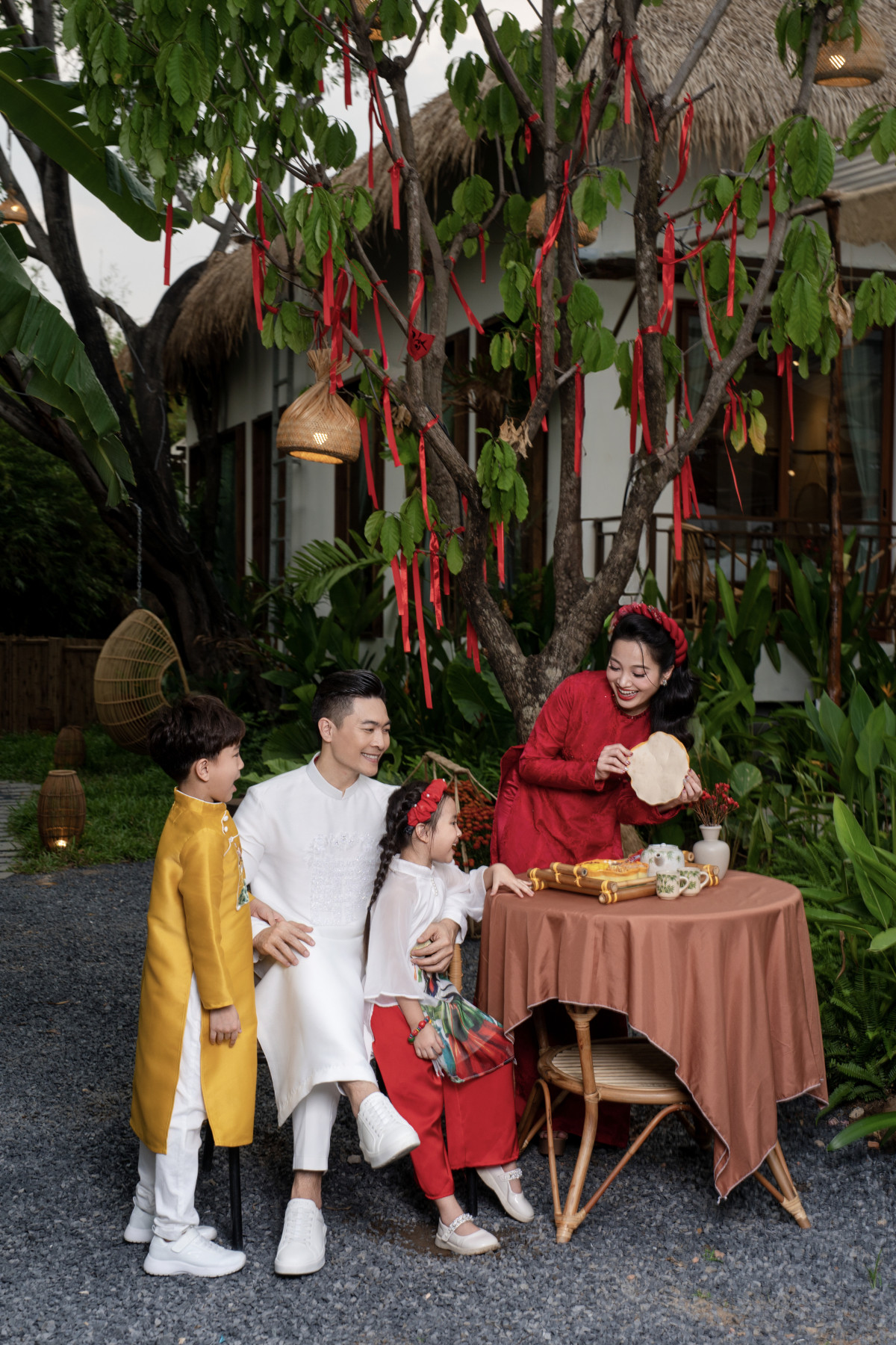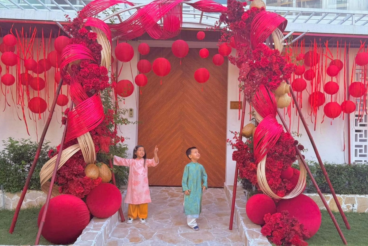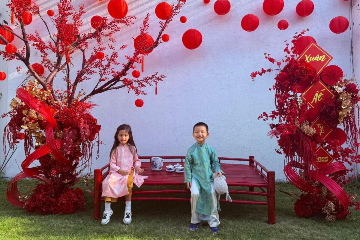 Những ngày cuối năm 2025, Hồ Ngọc Hà trang hoàng biệt thự ở đường Nguyễn Văn Hưởng, phường Thảo Điền, TP Thủ Đức với sắc đỏ chủ đạo, cầu may mắn, bình an cho bản thân và gia đình. Ca sĩ khoe ảnh hai con Lisa (trái) và Leon diện áo dài chụp ảnh trong không khí Tết Ất Tỵ sắp đến.