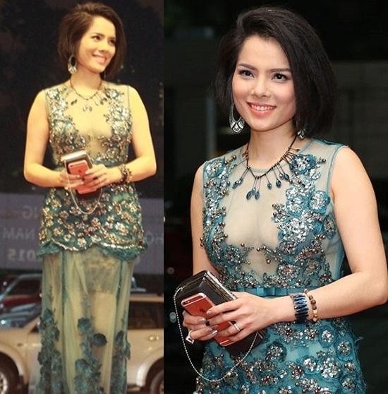Phương Mai lựa chọn bộ váy màu xanh kết hợp áo xuyên thấu để lộ bra
