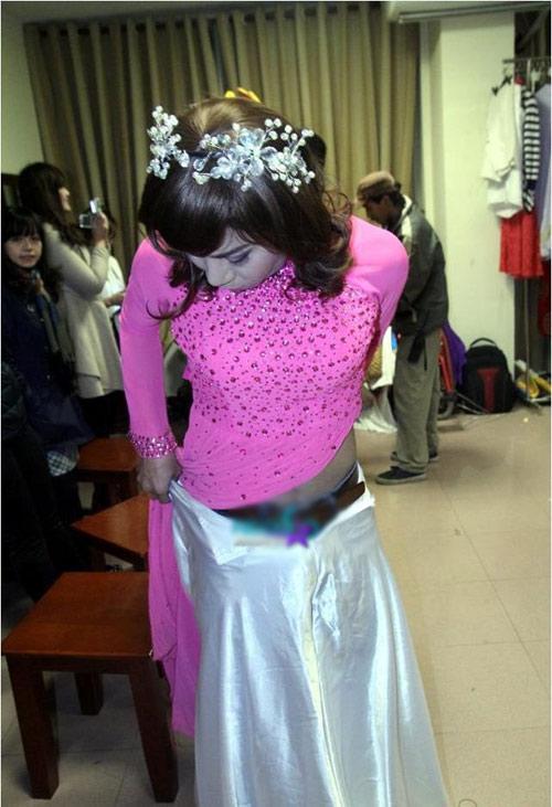 "Cô Đẩu" Công Lý vội vàng mặc áo dài trong hậu trường mà không để ý phóng viên.