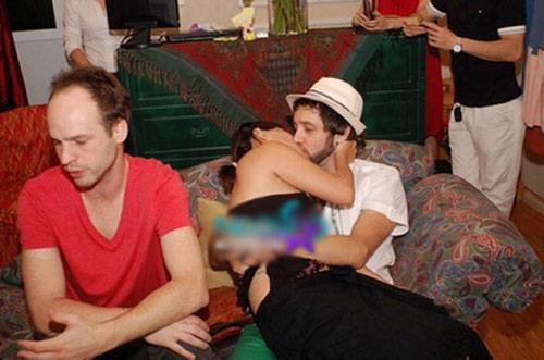 với hai người đẹp. Bàn tay của anh đặt đúng vòng 1 của cô gái đứng bên phải