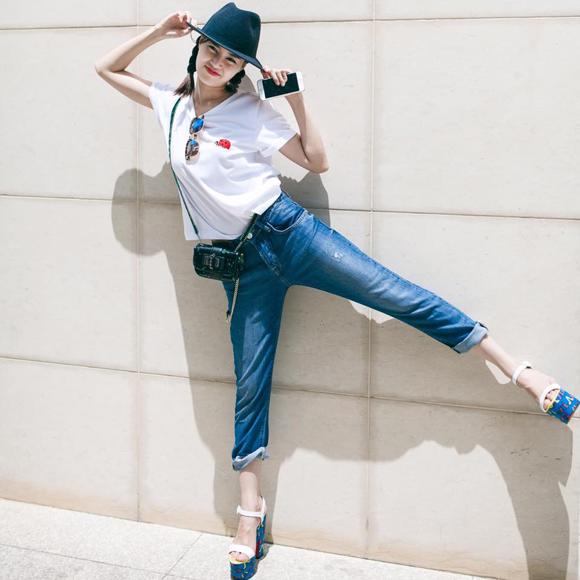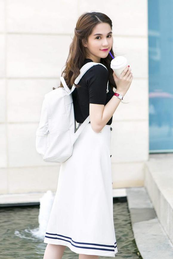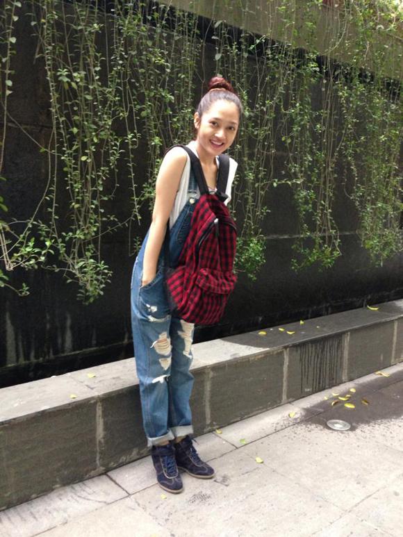 Không ai có thể nghĩ được rằng đây là bà mẹ một con. Hà Tăng trông giống một cô bé học sinh cấp ba vừa mới đi học về theo công thức quần skinny, áo T-shirt, giày sneaker và ba lô