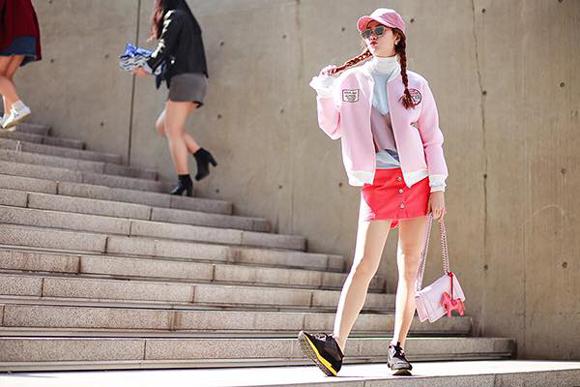 Minh Hằng chơi nguyên cả cây hồng từ chân váy mini, áo bommer, mũ lưỡi trai. Bím tóc hai bên chính là công thức trẻ hóa của những cô nàng này