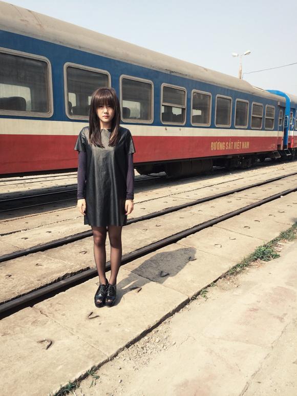 Văn Mai Hương trông cực kì baby với kiểu tóc mái bằng. Cô nàng khá hợp với những kiểu ăn mặc trẻ trung khi mặc chiếc váy xuông chất liệu da và giày oxford