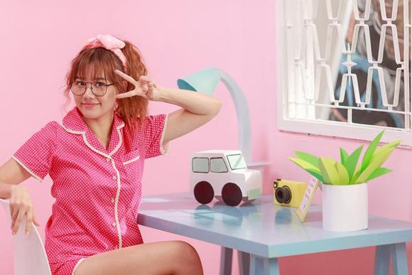 Trang Pháp trông lòe loẹt và trẻ con trong một MV. Cô nàng khá vui mắt khi diện váy xếp li chấm bi, áo T-shirt in hình nghộ nghĩnh. Điểm nhấn là chiếc khăn turban khéo léo buộc thành tai thỏ và quần skinny xanh nổi bật