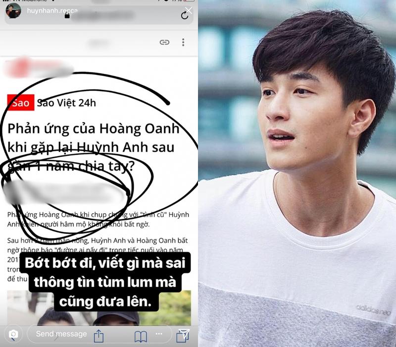 Sau gần 1 năm "đường ai nấy đi", chuyện tình dang dở của Huỳnh Anh và MC Hoàng Oanh nóng trở lại bởi những chia sẻ của người trong cuộc. Đăng tải loạt bài viết nói về anh và tình cũ, nam diễn viên Trái tim kiêu hãnh mới đây đã bày tỏ nỗi bức xúc. "Bớt bớt đi, viết sai tùm lum mà cũng đưa lên", Huỳnh Anh viết.