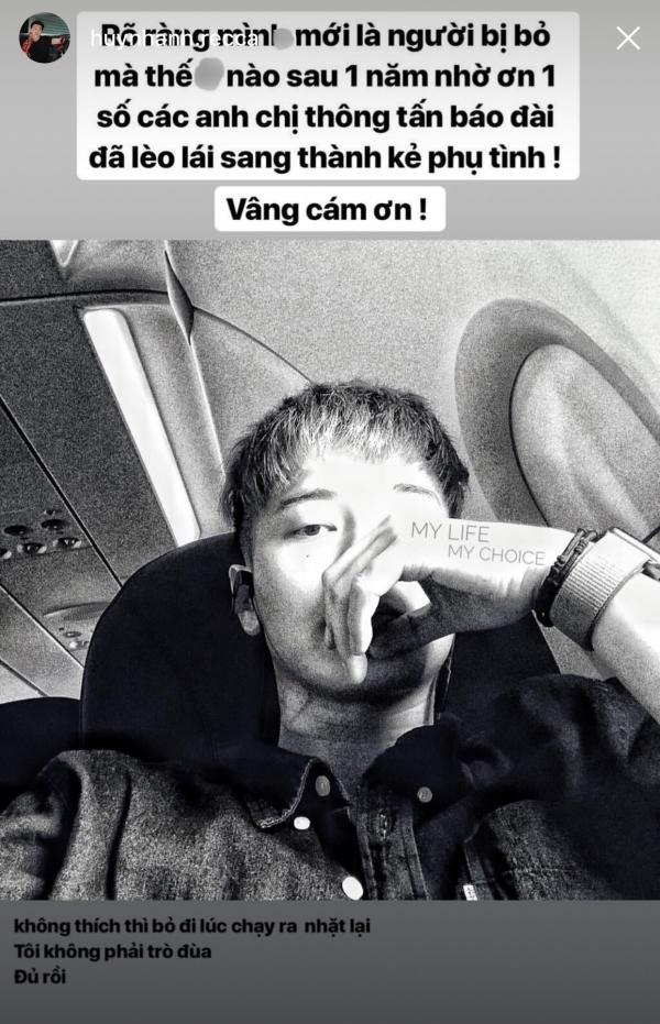 "Rõ ràng mình mới là người bị bỏ mà thế nào sau 1 năm nhờ ơn một số các anh chị đã lèo lái sang thành kẻ phụ tình... vâng cám ơn", nam diễn viên được mệnh danh "bản sao Lee Min Ho" cho hay.