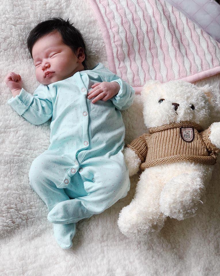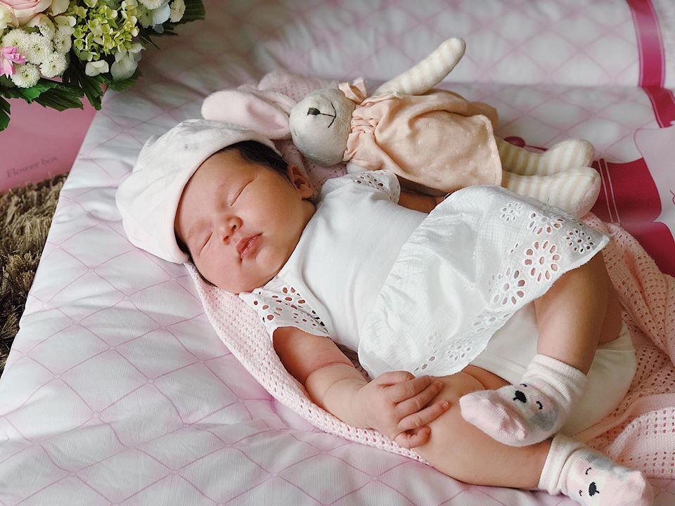 Nói là làm, ba em lôi hai cây lược bé tí xíu ra chải mái tóc quăn nhẹ, mềm mượt và nâu sẫm như những sợi tơ của em cho đến khi bóng mượt. Em tắm xong, giờ ba xin được ôm ru em ngủ sau khi em ti mẹ và tranh thủ selfie với em gửi cho các bạn. Tội nghiệp em, mới 2 tuần tuổi đã phải làm đồ chơi cho ba mẹ em", Hà Anh tâm sự.