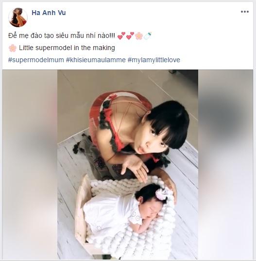 Mới đây, chân dài họ Vũ bất ngờ tiết lộ kế hoạch đặc biệt cho con gái đầu lòng. "Để mẹ đào tạo siêu mẫu nhí nào", Hà Anh đính kèm status hình ảnh cô cùng nhóc tì xinh xắn.