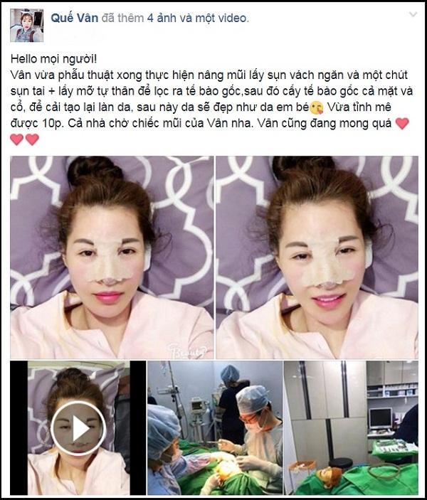 Vừa tỉnh lại sau ca phẫu thuật, Quế Vân đã hào hứng chia sẻ niềm vui. Cô không ngần ngại đăng tải những hình ảnh và clip liên quan lên trang cá nhân trong quá trình đi tìm chiếc mũi hoàn hảo.