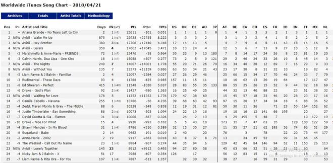 Bên cạnh đó, nhiều bài hát gắn liền với tên tuổi Avicii cũng vươn lên những vị trí hàng đầu tại bảng xếp hạng Itunes toàn cầu. Hey Brother và Levels lần lượt xếp ở vị trí thứ 2, 3.