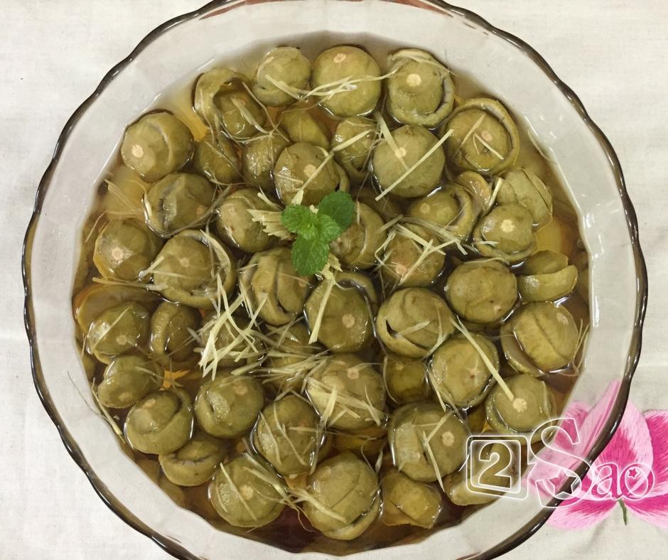 Bước 5: Lấy 1 cái lọ hoặc bát to cho sấu vào, cho thêm chút muối tinh, gừng thái sợi, nước đường đã nguội đổ lên trên. Để chỗ thoáng mát 2 ngày là ăn được.