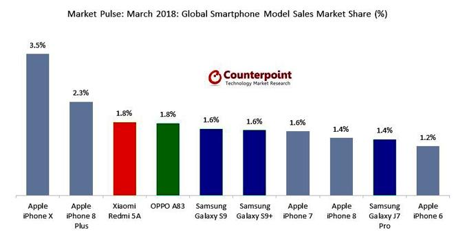 Mới đây, công ty nghiên cứu thị trường Counterpoint Research đã phát hành danh sách các điện thoại thông minh bán chạy nhất trong tháng 3. Đứng top 1 không ai khác là iPhone X của Apple với 3,5% thị phần. Ở vị trí thứ hai, với 2,3% doanh số smartphone toàn cầu trong 31 ngày của tháng 3 là iPhone 8 Plus. Và lần đầu tiên trong lịch sử, Xiaomi tự hào là nhà sản xuất Android bán “chạy” nhất trong tháng 3 với Redmi 5A chiếm 1,8% thị phần, ngay sau đó là Oppo A83 tầm trung.
