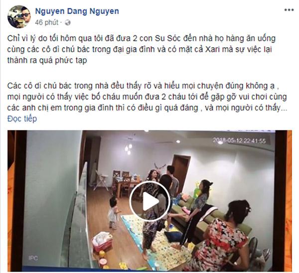 Kèm theo lời giải thích là đoạn clip dài 28 giây được trích từ camera trong nhà Đăng Nguyên ghi lại cảnh Hằng "Túi" xông vào tát anh, còn Xari đứng phía xa bế con, không làm gì.