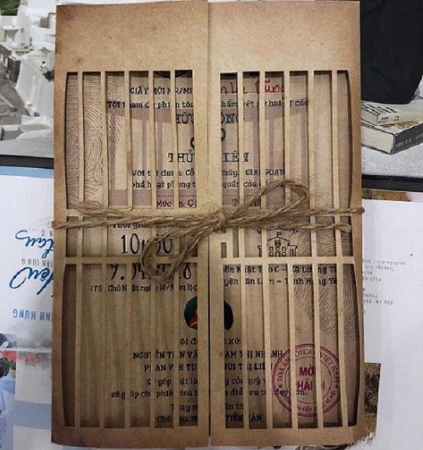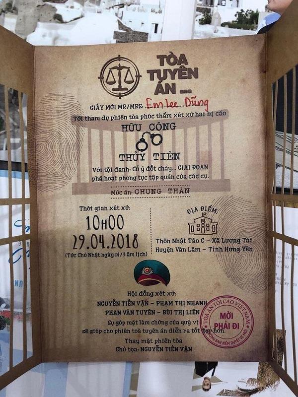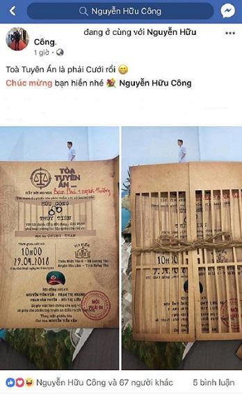 Chia sẻ về tấm thiệp cưới mang phong cách "Tòa tuyên án" của mình, chú rể tương lai cho hay: "Tấm thiệp cưới này do tự tay tôi thiết kế, phía trước của tấm thiệp là hai cánh cửa như cánh cửa nhà giam, bên trong mô phỏng một bản tuyên án với mức án hai vợ chồng phải sống chung thân với nhau. Toàn bộ thời gian lên ý tưởng, thiết kế và in ấn là mất khoảng 10 ngày".