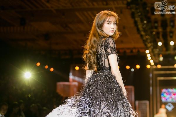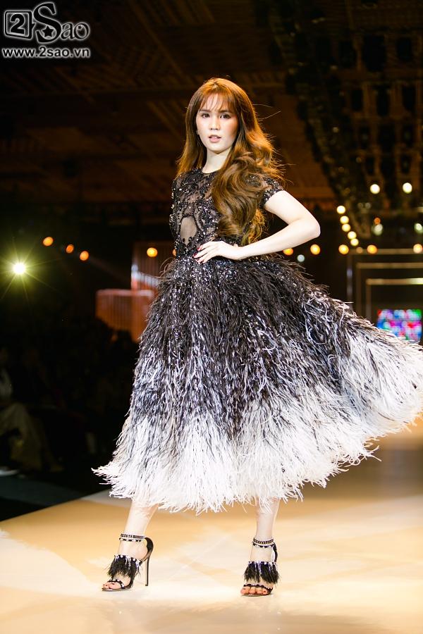 Mở đầu show diễn, "nữ hoàng nội y" bước ra trong tràng pháo tay của khán giả. So với các lần trước, Ngọc Trinh đi catwalk tốt hơn thấy rõ. Cô sải bước nhanh, gọn, dứt khoát trong bộ váy đính lông vũ xòe chữ A.