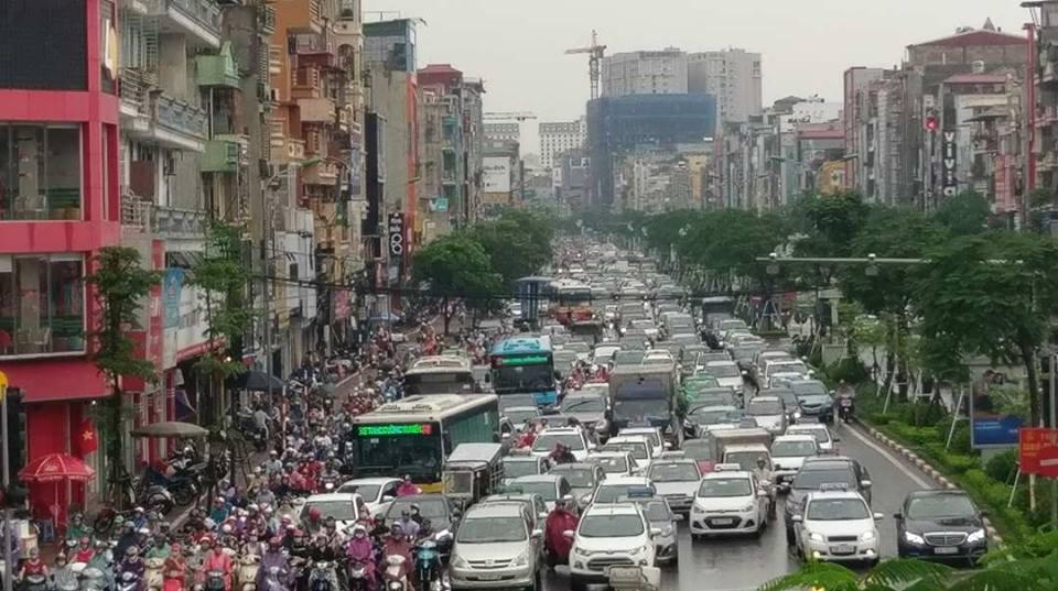 Đường Trần Hưng Đạo ùn tắc sau mưa. Ảnh: Vũ Điệp