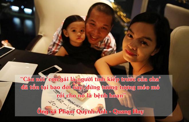 Nhạc sĩ Quang Huy - ông xã Phạm Quỳnh Anh: "Bố con tôi yêu thương nhau trong sáng, và tôi vẫn thích câu ví von 'con gái là người tình kiếp trước của cha'... Nghe để hình dung đến sự yêu thương ngọt ngào thôi. Một câu nói tồn tại bao đời nay nó có sự sống của nó, đừng tưởng tượng méo mó rồi cho là bệnh hoạn! Một bức tranh khoả thân thấy nó là nghệ thuật hay bậy bạ là do người ngắm thôi...".