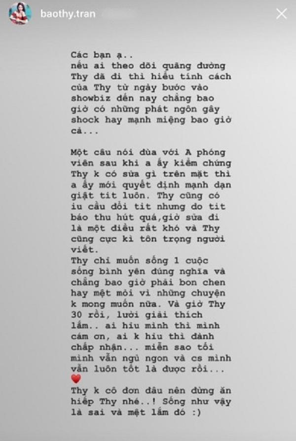 Trên story Instagram cá nhân, Bảo Thy vừa có một status phân trần về phát ngôn thưởng 10 tỉ cho ai tìm ra bằng chứng phẫu thuật thẩm mỹ của mình. Cô cho biết đó chỉ là câu nói đùa nhưng không ngờ lại được phóng viên đưa lên giật tít.