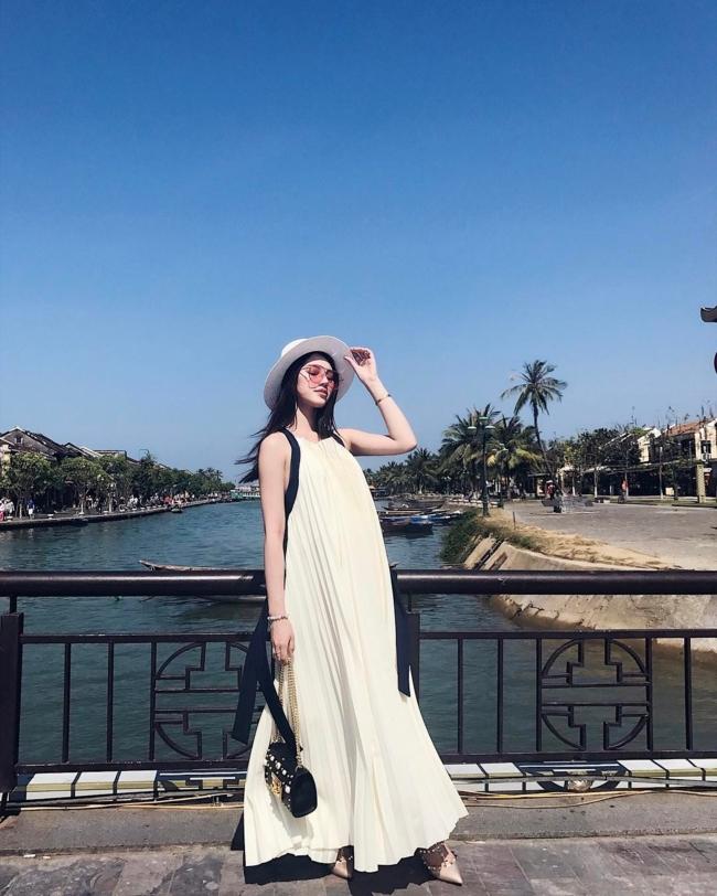 Jolie Nguyễn nữ tính thướt tha với váy maxi dập li cùng đôi cao gót đinh tán hãng Valentino quen thuộc.