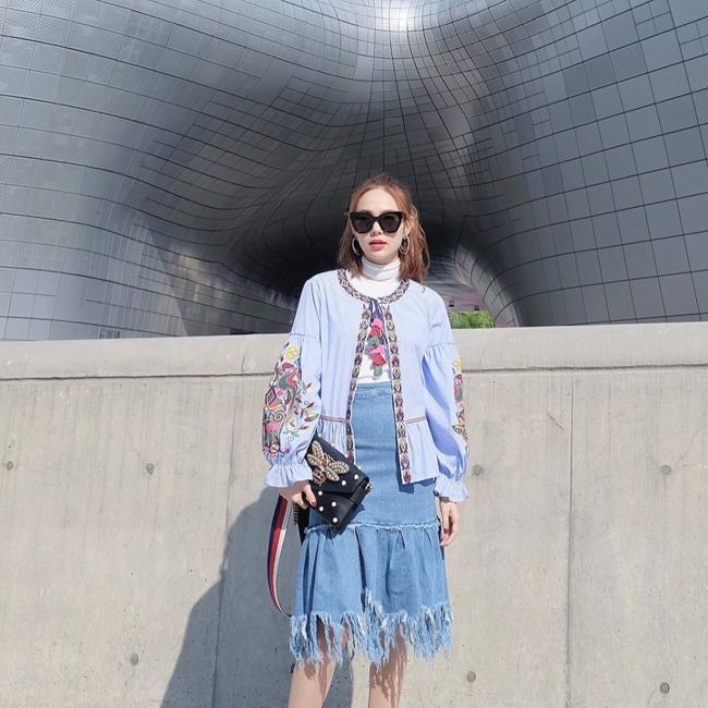 Thu Thủy chất lừ khi diện những item đình đám của mùa hè năm nay: chân váy denim dáng dài, giày cao gót trong suốt, áo thun crop - top và kính gọng tròn sành điệu.