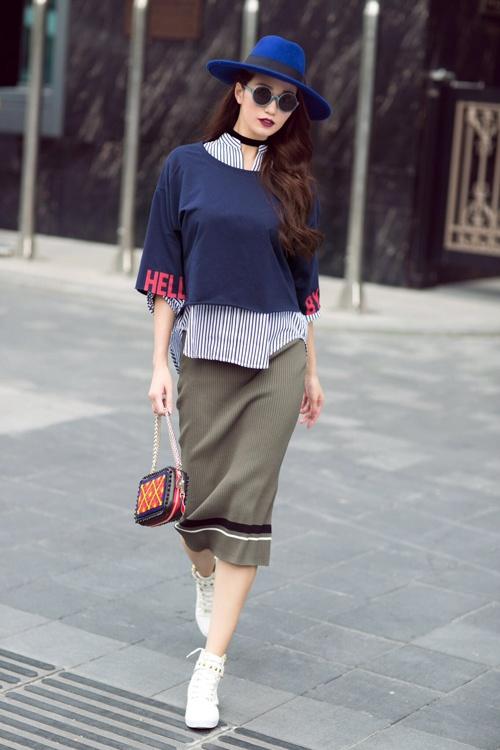 Với sự hỗ trợ và tư vấn từ stylist Travis Nguyễn, style của Khánh My ngày càng thăng hạng.Cô nàng gây ấn tượng với cách mix layer hoàn hảo: áo crop - top mix cùng áo sơ mi kẻ dọc, chân váy midi, giầy sneaker độn đế và mũ fedora.
