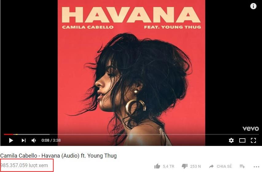 Havana của Camila Cabello ra mắt khán giả hồi tháng 8/2017, đến nay ca khúc đã đạt 985.357.059 lượt xem trên Youtube. Đây cũng là ca khúc chiếm top cao trong mọi bảng xếp hạng âm nhạc US-UK thời gian qua.