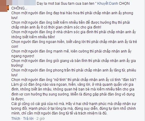 Dòng trạng thái nói về "nguyên tắc chọn đàn ông của người phụ nữ thông minh" của nữ diễn viên Bến tình yêu đã thu hút sự quan tâm đặc biệt. Bên cạnh hàng nghìn lượt like đồng tình, một Facebooker đã dùng một bình luận dài của người khác nhằm nhắn nhủ ngôi sao làng giải trí.