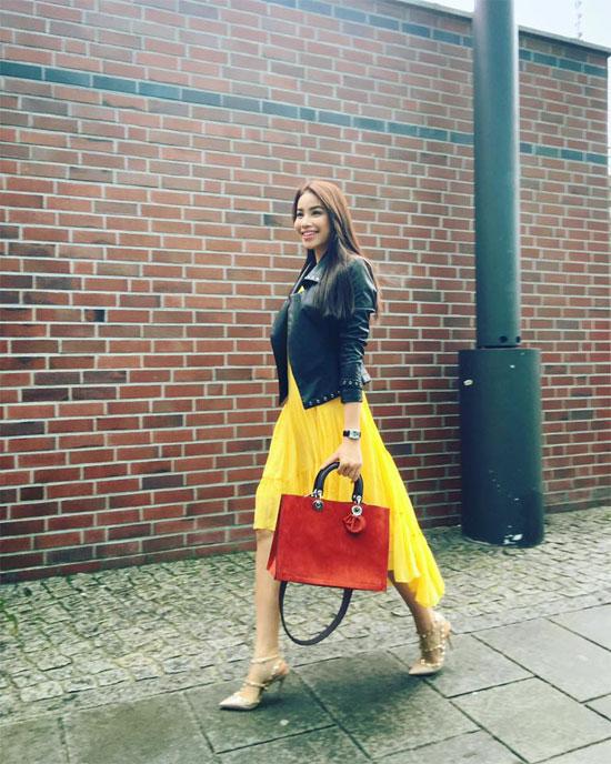 Áo khoác denim Celebee, váy hiệu O!Oi, giày Rekken, túi Bruno Magli tạo nên