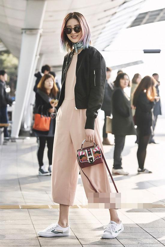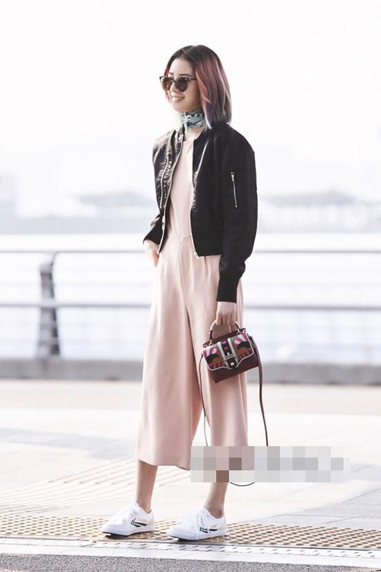 đôi với giới trẻ. Cô mặc jumpsuit màu nude, áo da lửng và giày thể thao