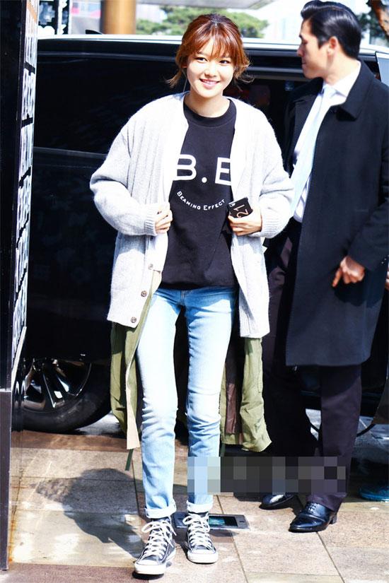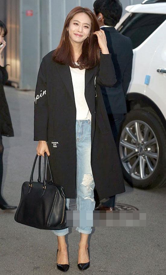 Thời trang đường phố của Park Jung Ah tuần này là quần jeans rách, áo phông trắng