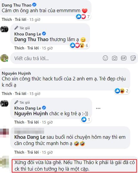 Đáp lại tình cảnh của Shark Khoa, hoa hậu Thu Thảo nhắn lại: "Cảm ơn ông anh trai của em". Doanh nhân họ Lê tiếp tục hồi đáp: "Thương lắm ạ"