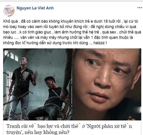 "Nào là đề nghị dừng chiếu vì quá bạo lực, không có tính giáo dục, làm ảnh hưởng thế hệ trẻ, quá sex, chửi thề quá nhiều... nhưng chốt lại vẫn một đặc tính quen thuộc là không đọc kĩ hướng dẫn sử dụng trước khi dùng", Việt Anh bức xúc.