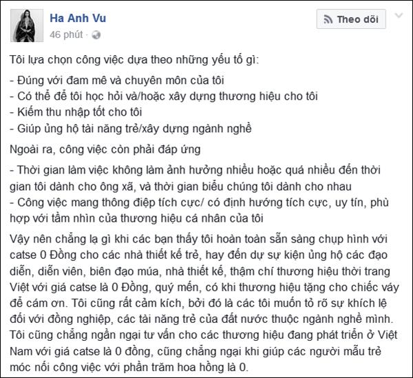 Mở đầu dòng chia sẻ, Hà Anh nêu rõ bốn tiêu chí để cô chọn một công việc phù hợp: Đúng với đam mê và chuyên môn; có thể học hỏi và xây dựng thương hiệu riêng; có thu nhập tốt và cuối cùng là cơ hội để phát triển tài năng trẻ trong nghề.